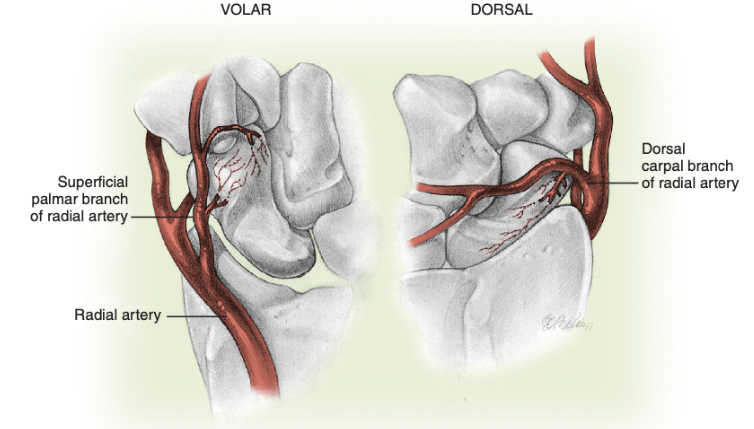 Figura: Vascularização do escafóide. Fonte “Greens Operative Hand Surgery 8th edition”.