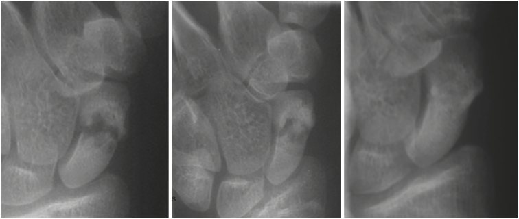 Figura: Raio X com colapso do carpo secundário a pseudoartrose de escafóide. Fonte “Greens Operative Hand Surgery 8th edition”.