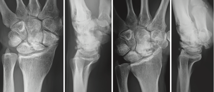 • Em casos mais avançados, sinais de degeneração articular e artrose do punho.