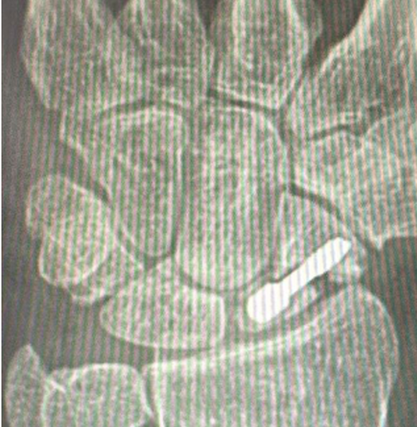 Figura: Tomografia computadorizada com pseudoartrose de escafóide fixada com placa e consolidada. Fonte: “Acervo pessoal”.