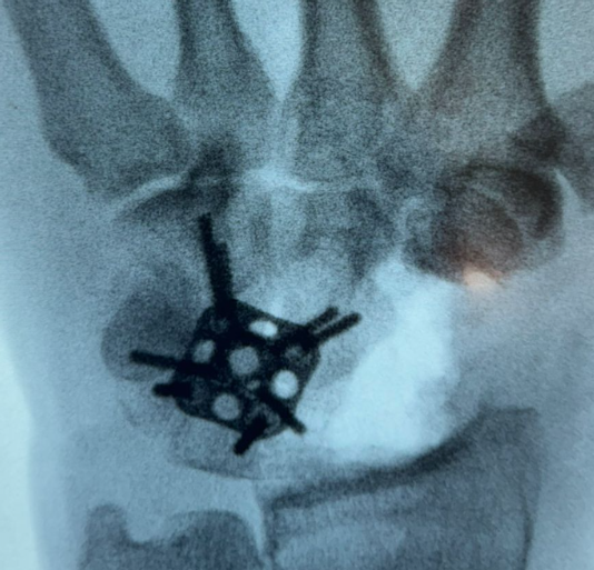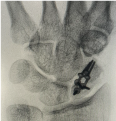 Figura: Fixação de colapso de escafóide com placa de artrodese 4 cantos. Fonte: “Acervo pessoal”.